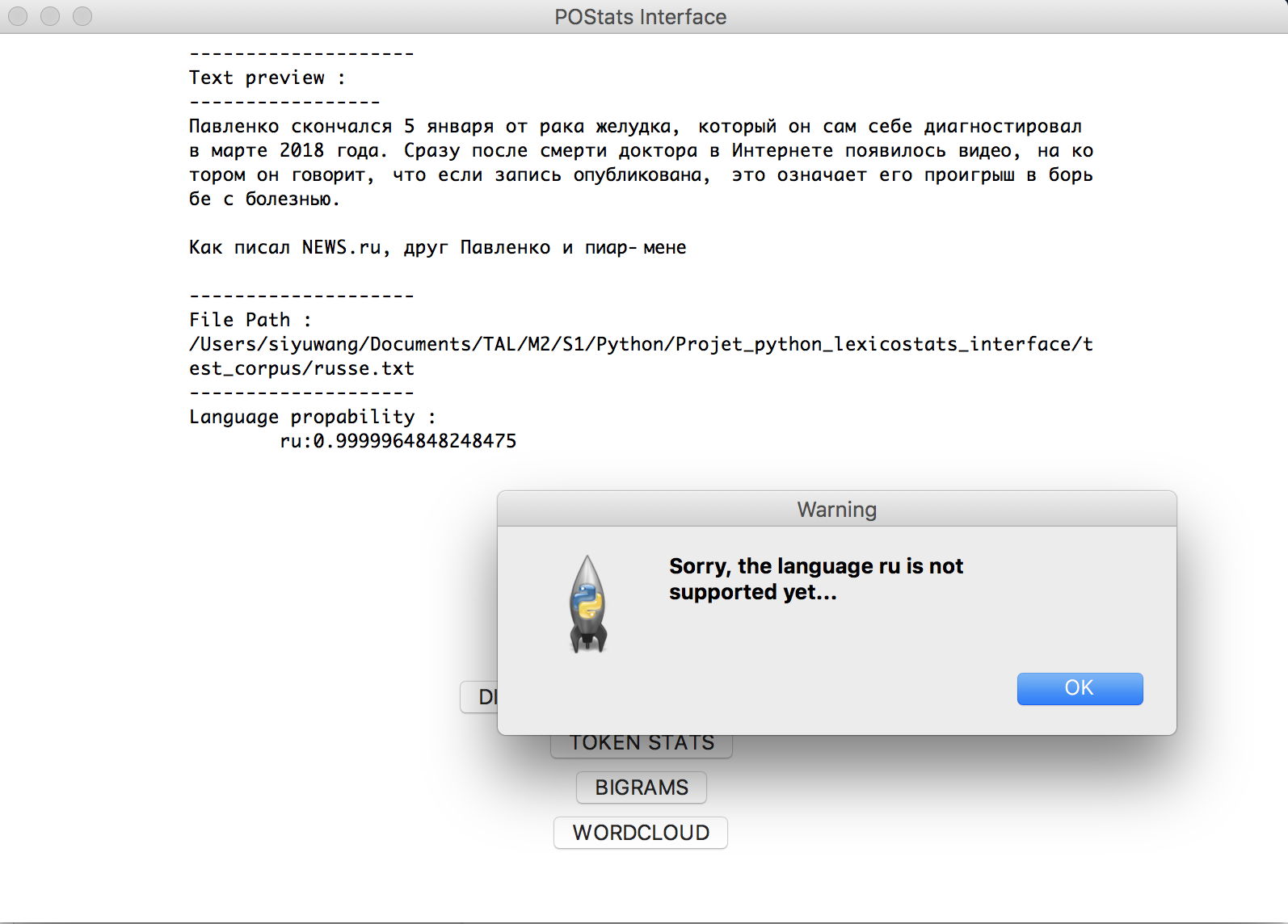 This is a project in python creating a program with a user interface to detect language, proceed with tokenization and POS tagging, and show statistic information of the input corpus.