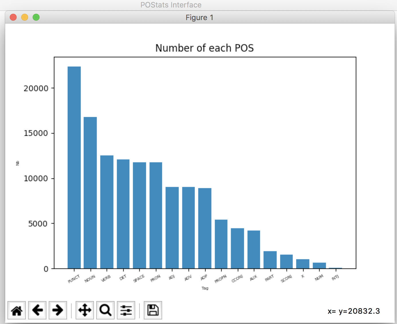 You can also check other statistical information such as the percentage of each POS, the most popular word, the most popular bigrams, etc...